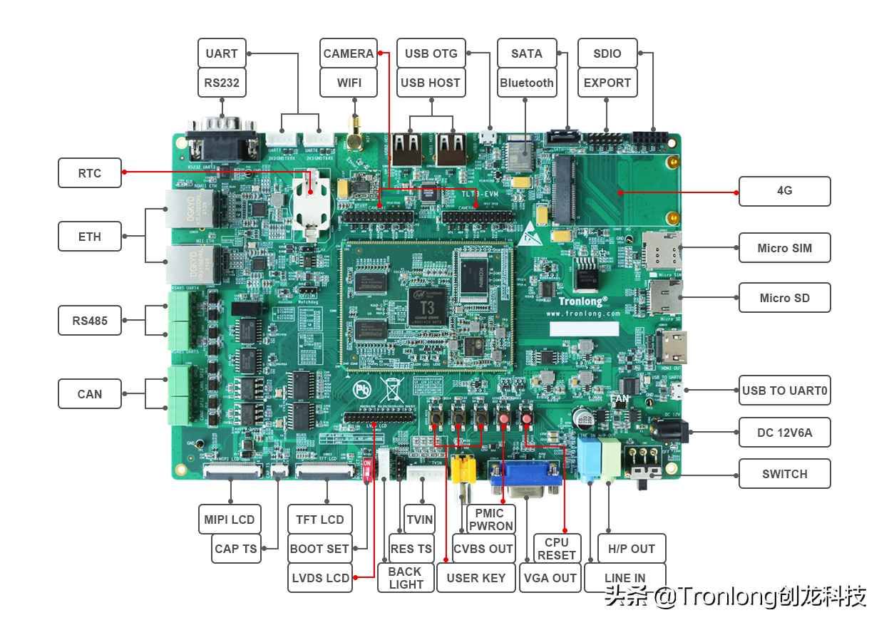3、接口测试 评估板已赠送SD系统启动卡,仅需正常上电即可启动评估板。备注:由于篇幅有限,本文仅提供部分接口测试数据。如需所有接口测试数据,请点击链接或微信扫码获取产品详细资料。http://site.tronlong.com/pfdownload