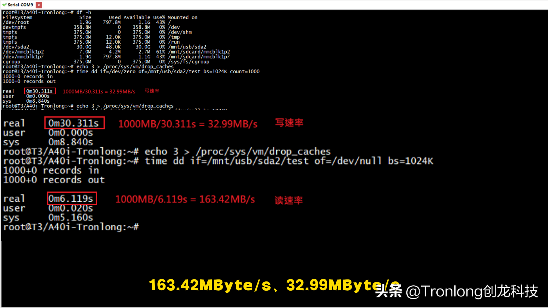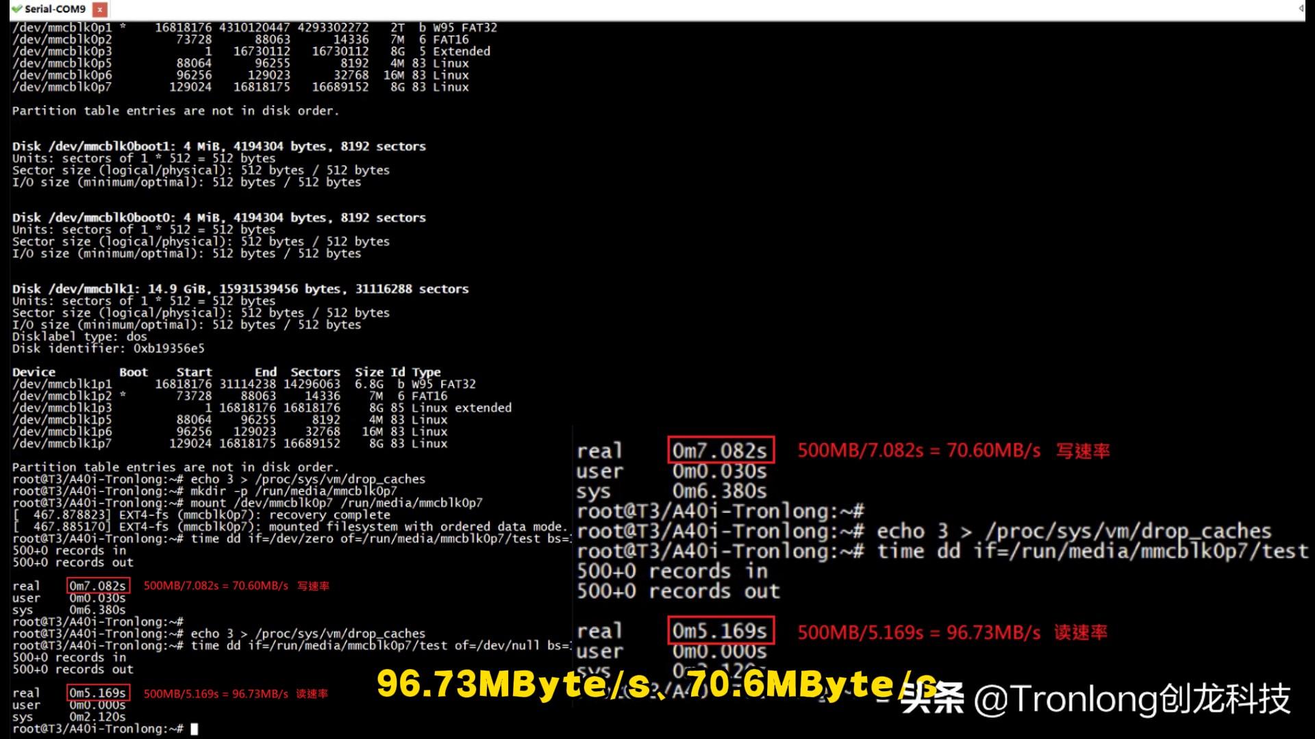 (2) eMMC读写测试 评估板采用康盈和江波龙的国产eMMC。执行如下命令对eMMC设备进行写速度测试。Target# echo 3 > /proc/sys/vm/drop_cachesTarget# mkdir -p /run/media/mmcblk0p7Target# mount /dev/mmcblk0p7 /run/media/mmcblk0p7Target# time dd if=/dev/zero of=/run/media/mmcblk0p7/test bs=1024K count=500执行如下命令对eMMC设备进行读速度测试。Target# echo 3 > /proc/sys/vm/drop_cachesTarget# time dd if=/run/media/mmcblk0p7/test of=/dev/null bs=1024K