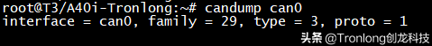 发送测试执行如下命令,接收PC端发送的数据。Target# candump can0