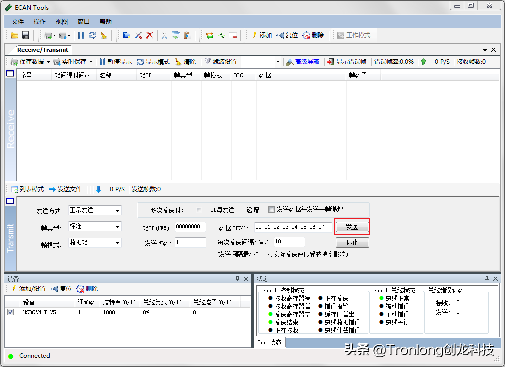 接收测试 评估板文件系统执行如下命令,发送数据至ECANTools软件,ECANTools软件收到数据说明功能正常。Target# cansend can0 123#1122334455667788