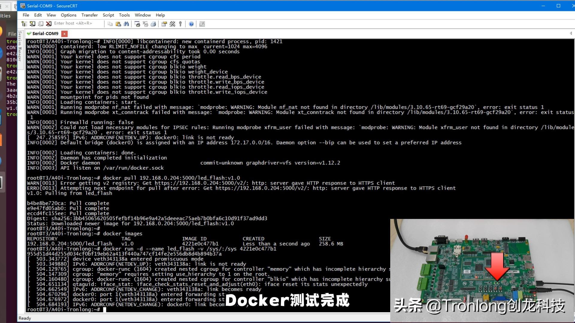 (4)下载镜像并运行容器 评估板创建容器并启动容器,耗时约1min,容器启动后评估板2个LED灯同时闪烁,停止容器后LED灯不再闪烁,Docker测试完成。
