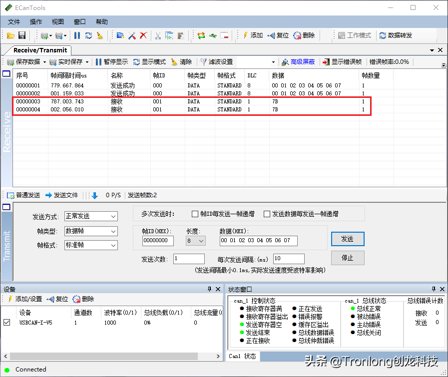 依次向接收端发送两组数据,在ECAN Tools及串口调试终端可看到数据,如下图所示。