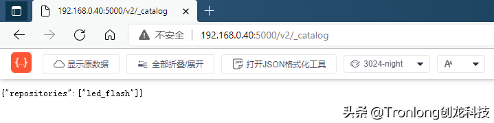 通过浏览器访问"http://192.168.0.40:5000/v2/_catalog",即可看到当前仓库里已有的镜像。