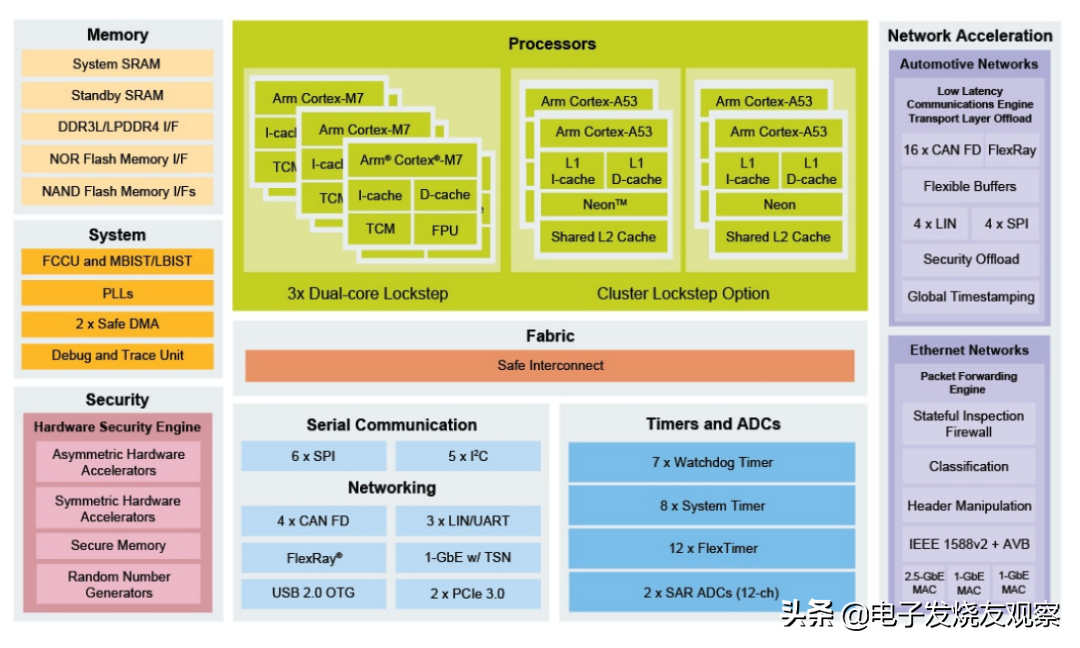 S32G2是一款恩智浦的车规级MCU,采用了各个基于Arm架构的Cortex-A53内核,具有两两锁步功能,主要负责高运算量的数据处理工作,同时,还采用了3个基于Arm架构的Cortex-M7全锁步内核,主要负责对实时数据的处理工作。内部还集成了多个加速引擎,低延迟通信引擎,具有20个CAN接口,用于汽车处理网络加速;数据包转发引擎,具有4个千兆网络接口,用于以太网网络加速;硬件安全引擎,用于安全启动和加速安全服务。该芯片符合车规级2级的应用标准,耐温为-40°C至105°C。
