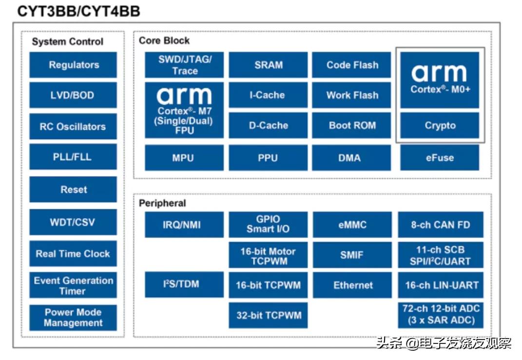 CYT3BB/4BB系列是英飞凌的车规级MCU,采用了Arm架构主频高达250MHz的Cortex ®-M7F 单/双核,4 MB 代码闪存和256 KB 工作闪存,该系列芯片具有高效的数据处理能力和优秀的网络连接能力,主要应用于汽车的车身控制模块、网关控制和汽车娱乐系统中。CYT3BB/4BB系列可通过以1个太网接口和8个CAN FD接口进行高速率的数据传输以及频繁的数据更改,除此之外还集成了20个LIN/UART接口和I2C、SPI可进行配置的串行通信接口。内部集成了12为的高速A/D转换器和220个可编程的 GPIO。CYT3BB/4BB系列采用了272 Pin的BGA封装,耐温范围为-40至 125℃。