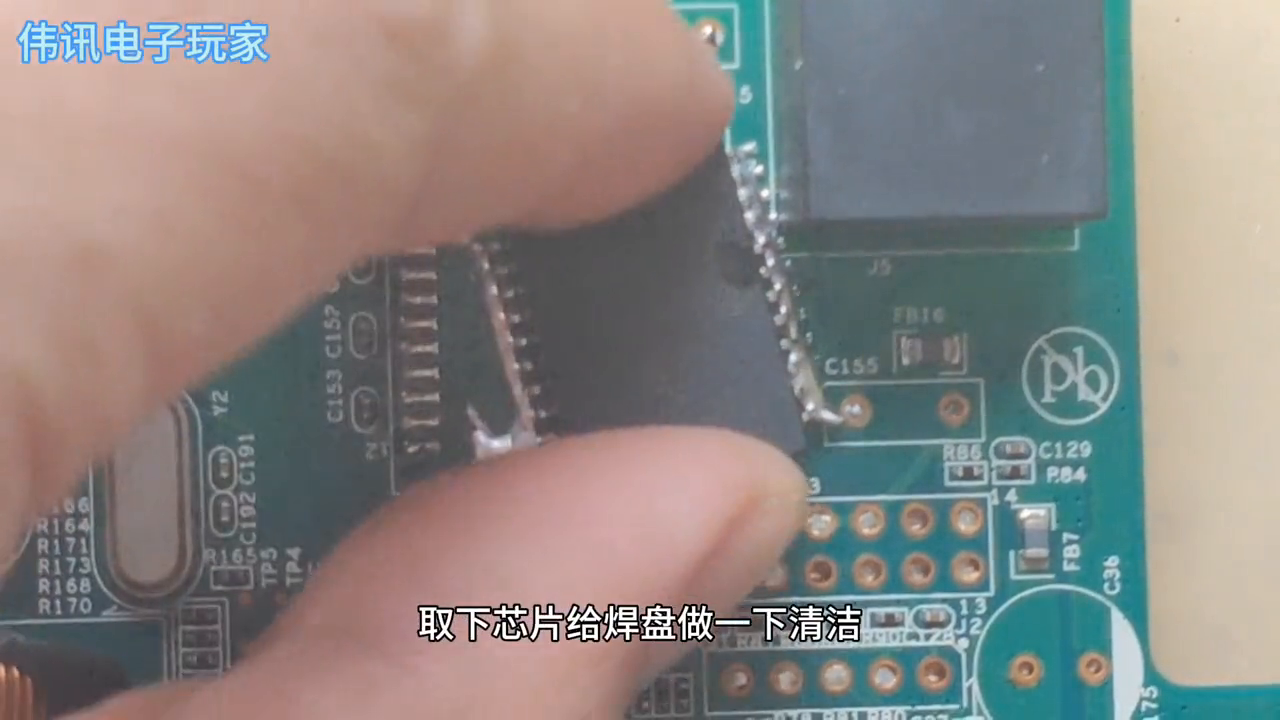 ·取下芯片,用清洁剂清洁焊盘,待清洗干净后,再将芯片装回去。清洗芯片时,要将其反过来,用烙铁将引脚上的焊锡清理干净,用洗发水擦拭多余的焊油,然后给焊盘的一个引脚镀上锡,固定好芯片。固定芯片时,要注意芯片的方向,确保每个引脚都对齐,焊盘不能有错位的情况。