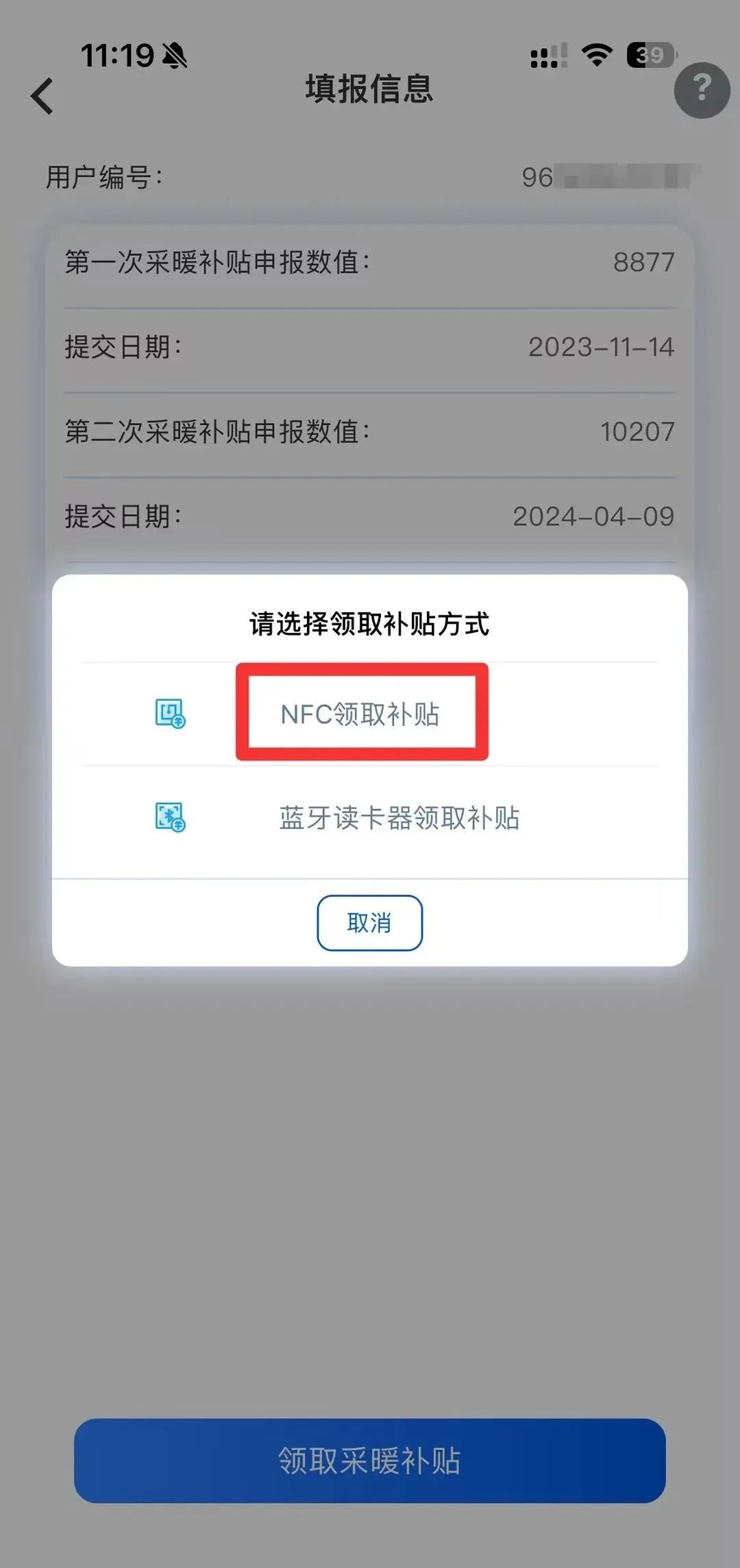 ►点击“领取采暖补贴”,点击“NFC领取补贴”,将燃气卡贴放在手机NFC感应区,根据界面提示进行操作。