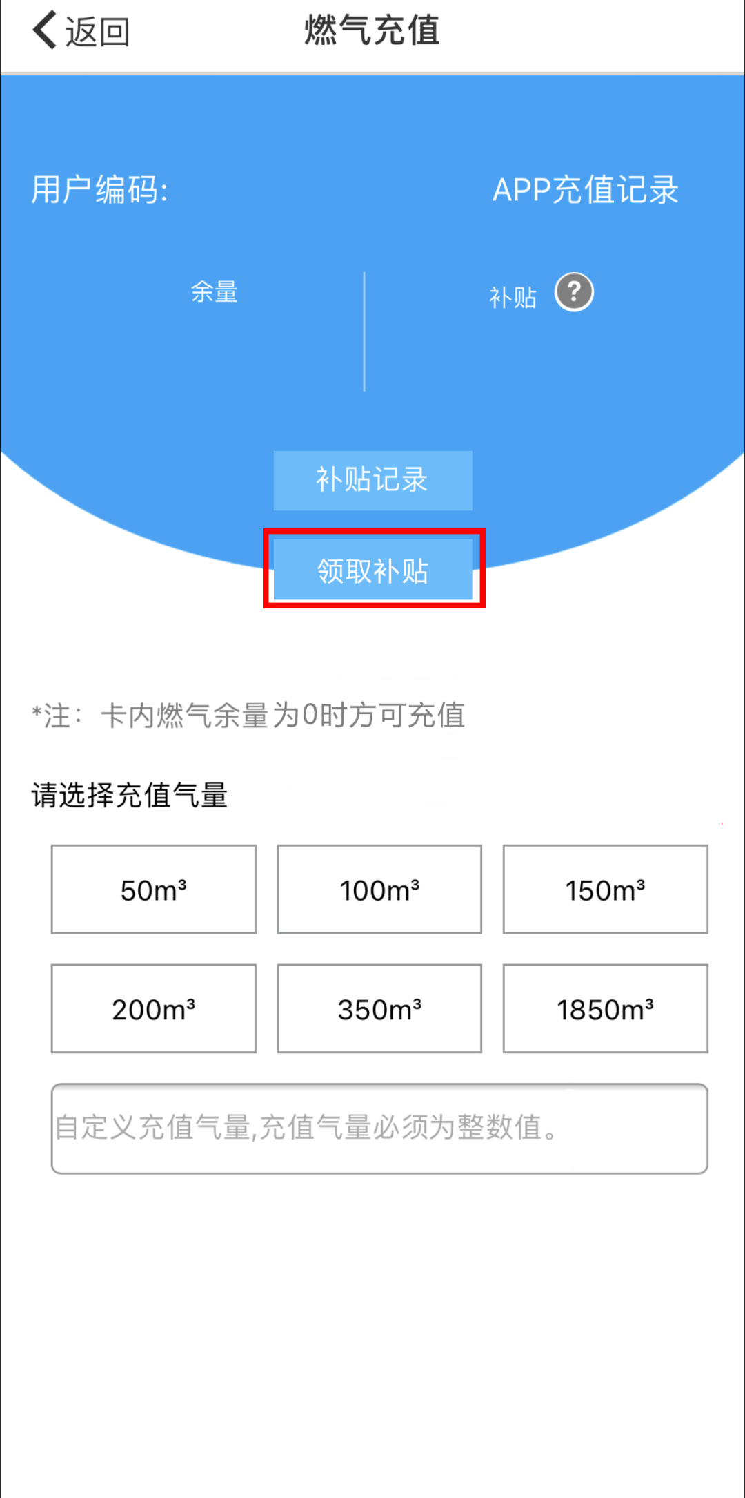 ③IC卡表用户卡内有气量,即不能购气也不能领取补贴。请先将燃气卡插入燃气表,完成气量输入后,再领取补贴。