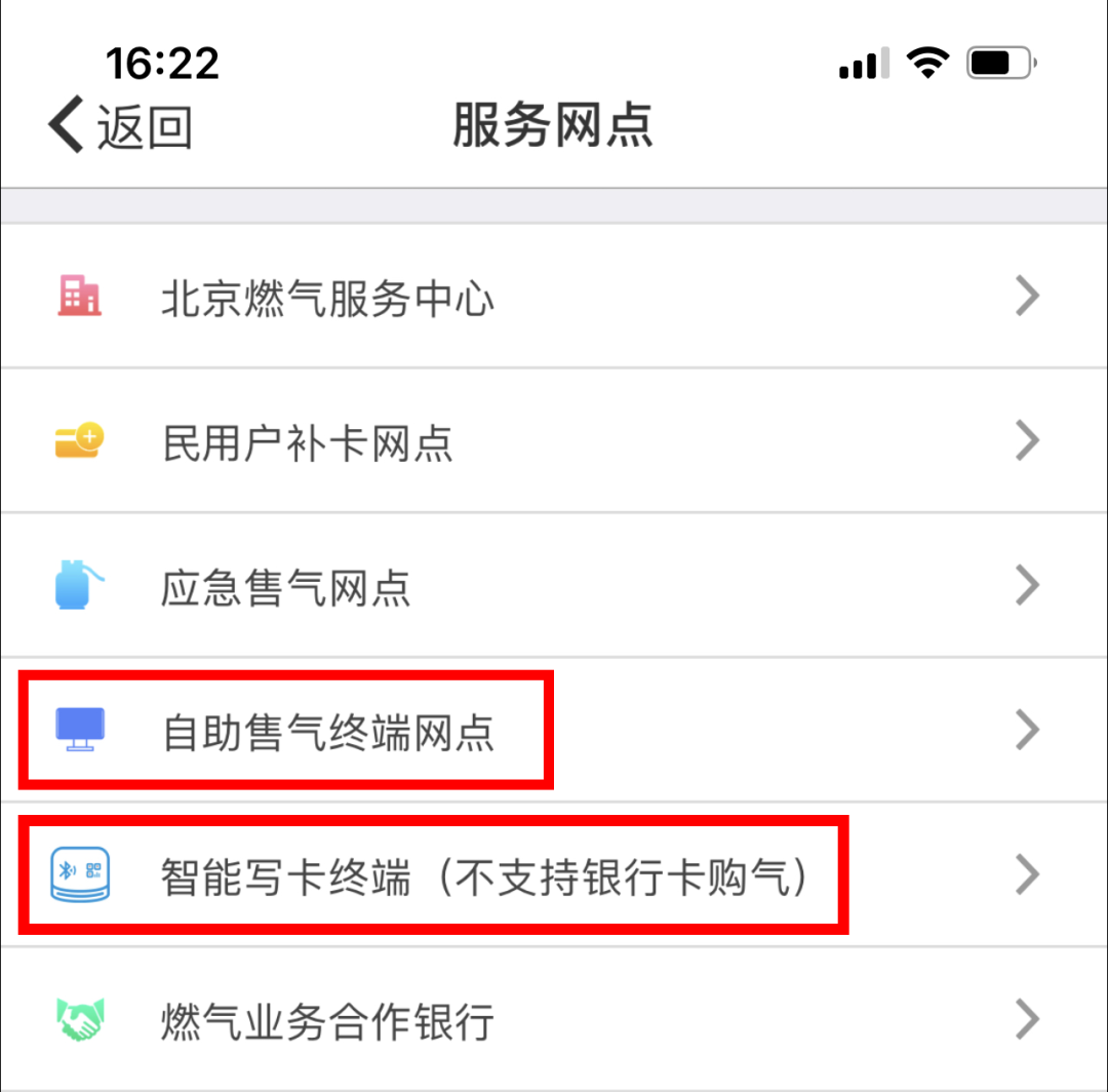 ①您可以进入“北京燃气”APP,点击主页的“服务网点”,选择“自助售气终端网点”即可跳转到服务网点列表界面;