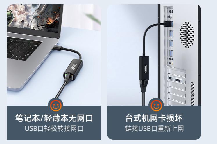 在高性能的基础上,优越者这款USB3.0外置千兆网卡,自适应千兆、百兆宽带,可以有效解决笔记本没有网口、台式机网口损坏,服务器网口等状况。