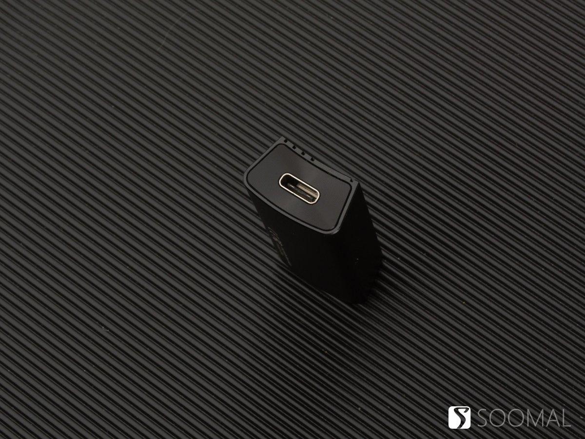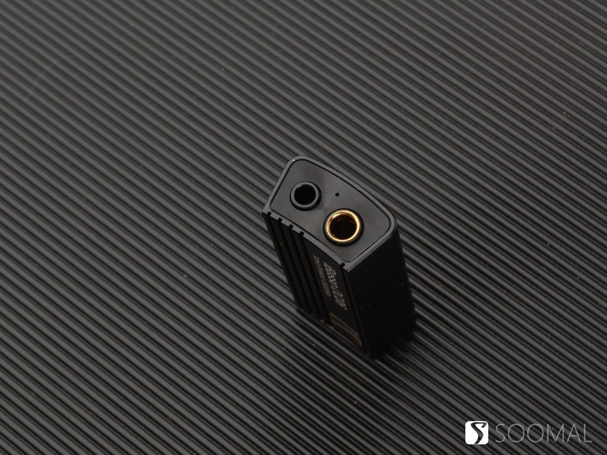 DC06长5厘米,重量23克,偏重,顶截面类似折扇扇面,窄的一面为正面,雕刻有平行槽纹装饰。外壳采用铝合金材质,表面喷砂,黑色阳极氧化处理,做工精致。周身无按钮。DC06两端为接口,一头为Type C,一头为耳机输出面部,包含一个3.5毫米单端和4.4毫米平衡输出口,以及一盏小小的信号状态指示灯。