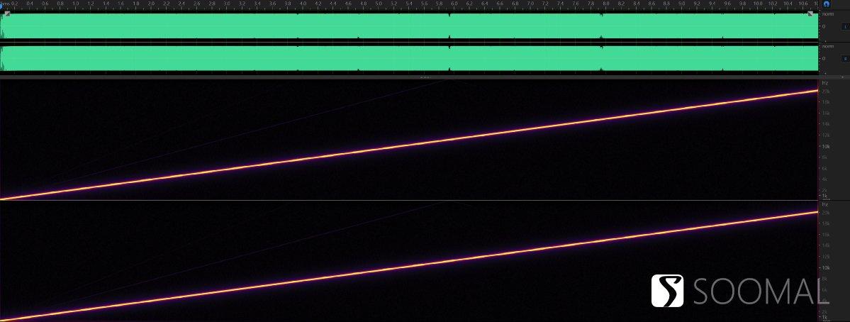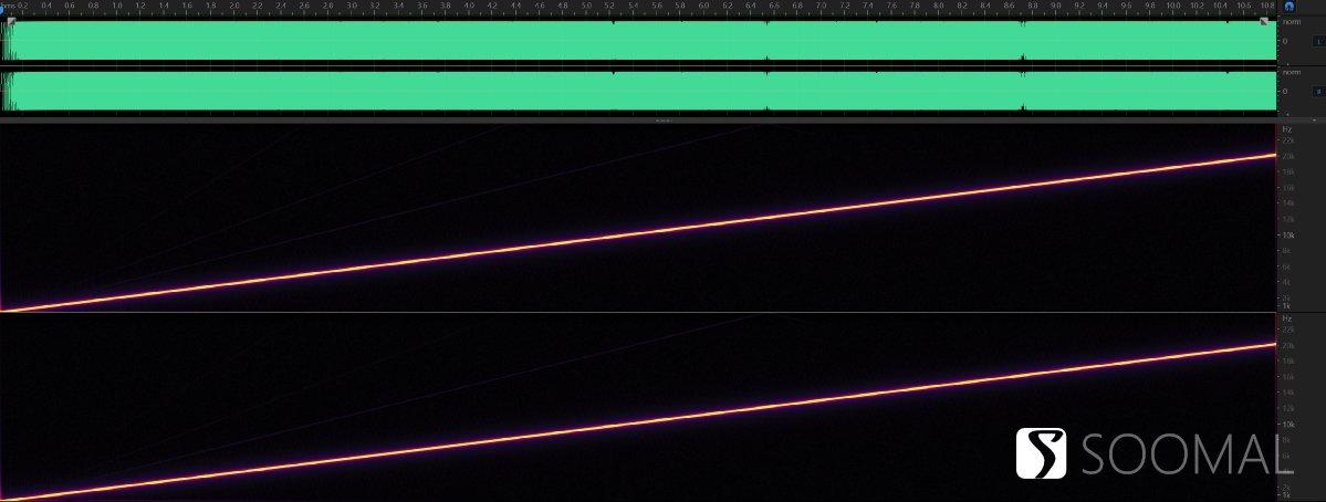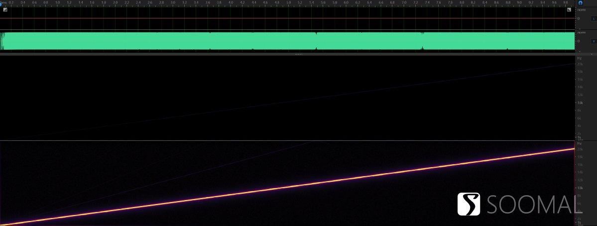为了让DC06最佳状态表现,测试在一台Windows设备上进行。44.1/48kHz的测试成绩优秀,没有出现SRC问题。但96kHz出现了问题,播放96kHz扫频型号,可以发现沿着48kHz横轴,大于48kHz的频率出现了镜像现象。更换操作系统、设备、音频API,该问题都存在,而系统显示,DC06的输出采样率已经被切换至96kHz,这种bug在以前测评中出现过,十有八九是硬件固件出现了问题。实听也能听到本应该向上升的频率出现了降频的扫描声。好在大部分音乐节目还是44.1kHz采样率存储的,所以这个bug虽然严重,但没影响到最常见的采样规格。在下面的主观听感部分,说涉及的曲目,均为44.1kHz采样规格。