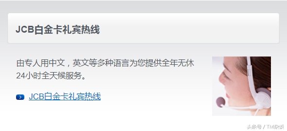 持有JCB白金信用卡的持卡人,可以拨打专属热线,由专人多种语言提供全年无休24小时全天候服务。除代订白金卡持卡人专属优惠餐厅、高尔夫球场等各项服务外,还提供旅游、娱乐以及信用卡紧急支援等服务。