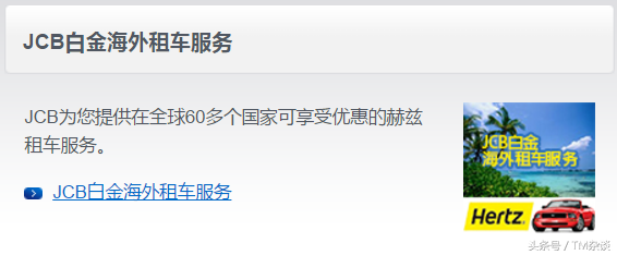 相信现在出国的朋友越来越多,在国外也开始流行起租车自驾。持有JCB的白金卡,可以在国外轻松租车,中国发行的JCB白金卡,国内代理服务商是赫兹租车,可提供全球60多个国家的租车服务。车型相对较新,基本可满足从商务到休闲等各种旅行方式。
