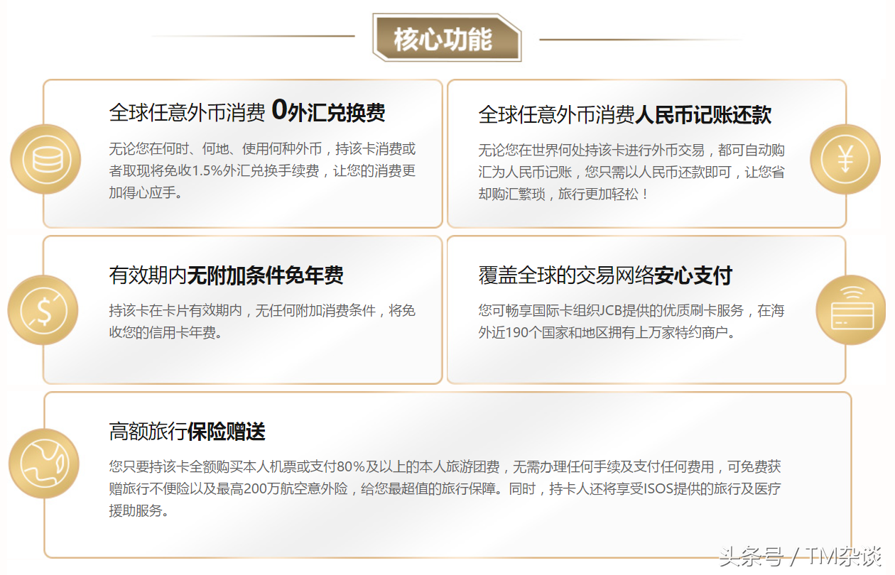 这张卡的权益除JCB卡组织本身的权益外,还有工行白金卡通用的权益,具体大家可以看这篇文章《讲一讲工行的小白金》。