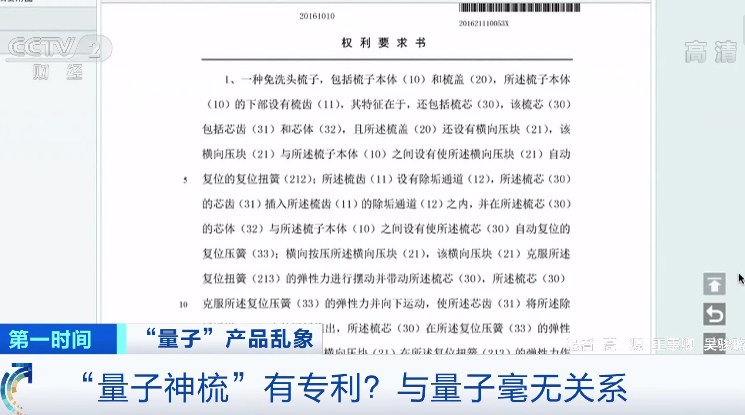 记者查询了量子神梳获得的专利号,发现该发明专利的名称与内容是“免洗头梳子”,通过设置复位压簧、除垢通道等以实现在梳头的过程中对头发和头皮进行清洁,和量子没有任何关系。而美容院宣传的量子细胞导入仪器,使用的仍然是射频原理,医学专家表示,射频美容仪器的原理,也和量子毫不相关。
