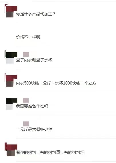 “内衣每公斤500元,水杯每立方1000元。”贝壳财经记者询问可代加工哪些产品时,广州弘皓电子科技有限公司相关人员介绍称不同产品代加工价格不一样,内衣等产品的材质记者可以挑选,材质轻重不同对应内衣件数也有差别。
