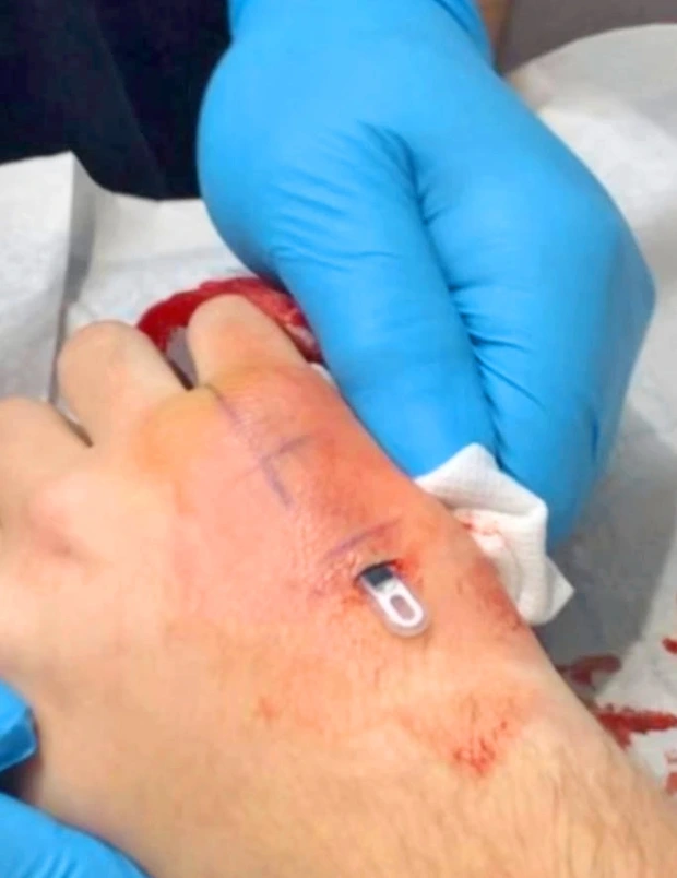 手术过程很简单,外科医生直接在他的手背皮肤下开了一个小口,然后把仅有半毫米厚的芯片嵌入进去,最后进行缝合,整个过程大约只需要15分钟。