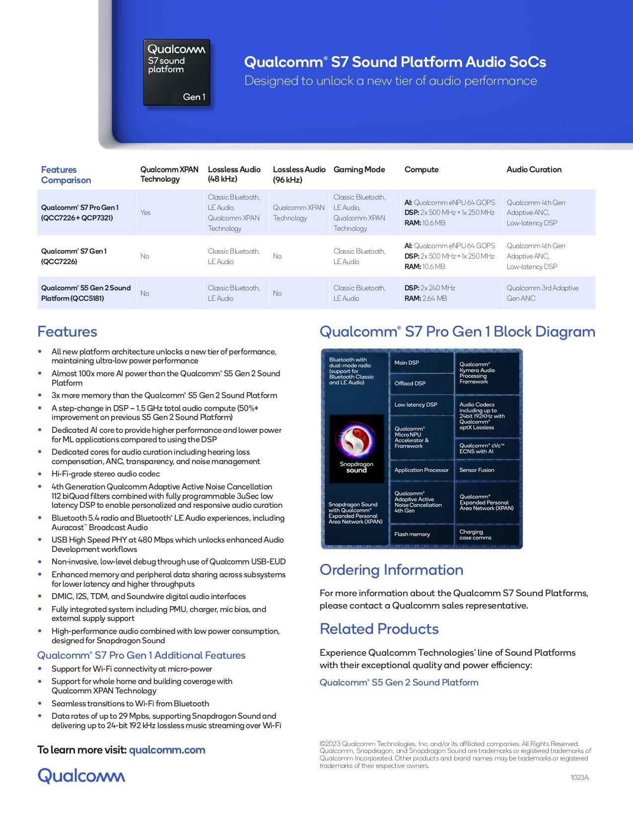 S7 和 S7 pro 还具有设备端人工智能功能,可实现更好的音频个性化。它还支持高达 192kHz 的无损音乐和增强的游戏多通道空间音频,还支持 Qualcomm Seamless,以实现更好的跨设备连接。IT之家在此附上相关说明文档如下: