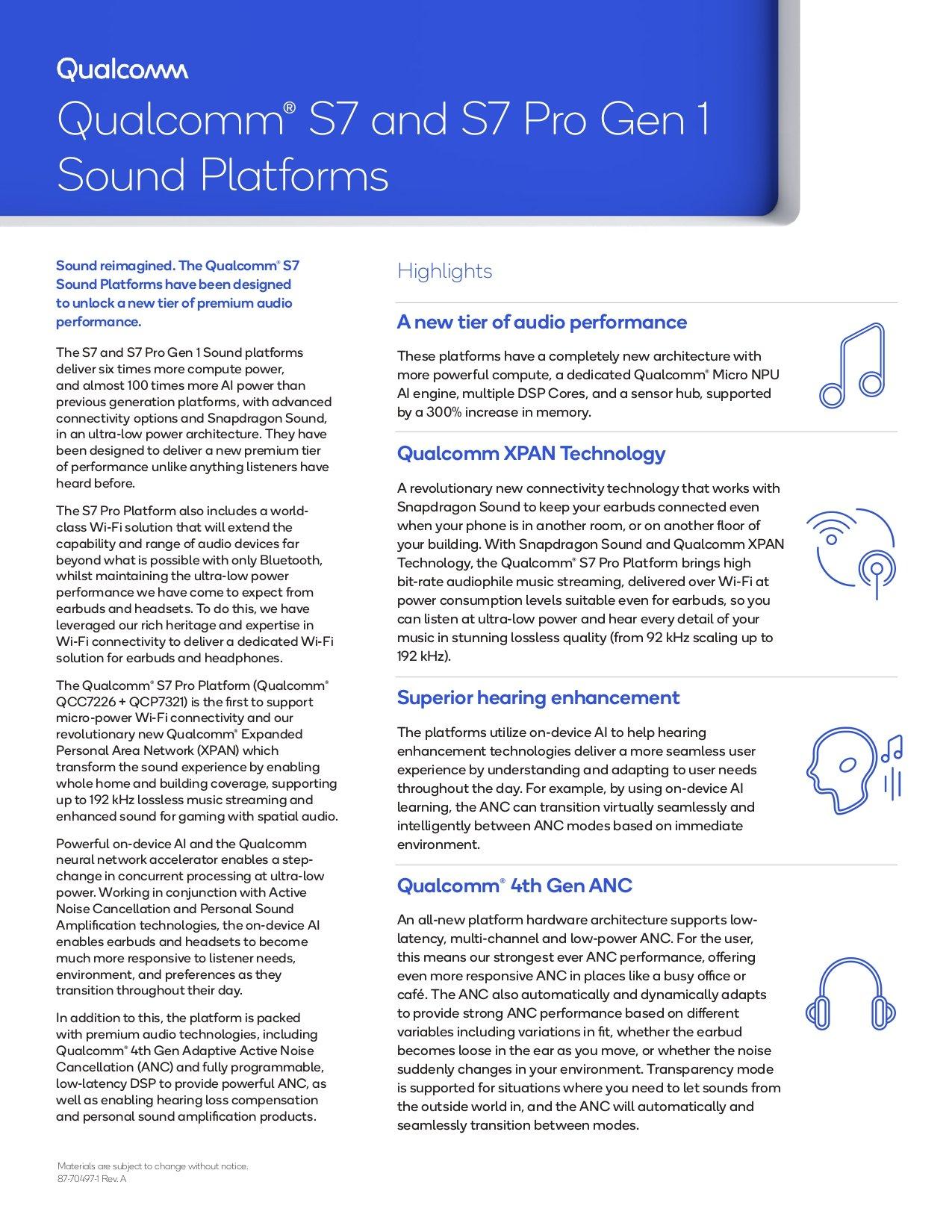 S7 Pro 声音平台率先支持高通扩展个人区域网络技术(XPAN) 和 Micropower Wi-Fi 连接,提供比蓝牙更卓越的音频范围。