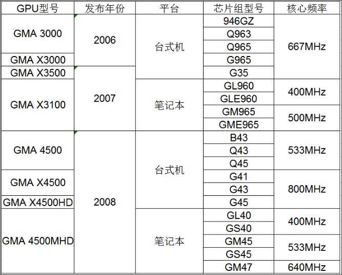 在X3000之后,Intel只设计了一个采用Gen4.0架构的系列-IntelGMA 4500系列,由四个型号组成,GMA X4500HD(G45芯片组)、GMA X4500(G41、G43芯片组)、GMA 4500(B43、Q43、Q45芯片组)、GMA 4500MHD(GL40、GS40、GM45等芯片组),其中三个版本为桌面版本,GMA 4500MHD则是为移动端设计。 这个系列中性能最差的的是GMA 4500,核芯频率为533MHz。 GMA X4500和X4500HD的核芯频率均为800MHz,GMA4500MHD频率有400MHz和533MHz两个版本。