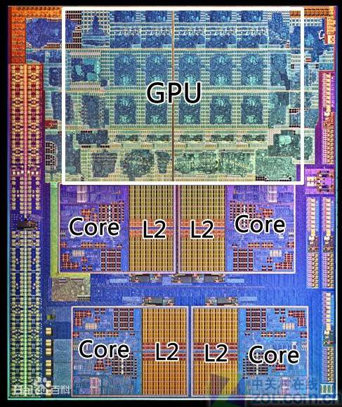 Intel之前的显卡都是集成在主板的北桥上,而从这一代开始,Intel也开始将显卡集成在CPU中,尽管CPU和GPU集成在一块芯片上,因为GPU单元并没有与CPU核芯融在一起,而是单独一个部分被放置在CPU基板上,因此与前代产品性能并没有相差太多。