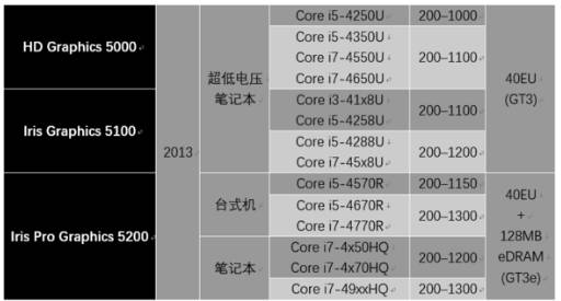 2013年Intel发布了基于Haswell架构的22nm处理器,而新的HD Graphics与Ivy Bridge架构类似,可以被视为Ivy Bridge核显的扩展,这次就连HD Graphics支持清晰视频技术以及Quick Sync Video技术了,作站平台主流型号至强E3均使用P4600、P4700专业级核芯显卡,而P4600的专业计算能力已经甚至超越了NVIDIA入门级专业卡K600,但是因为驱动的原因,还是比较的鸡肋。从此开始,超极本的性能大幅度提升,也越来越被用户喜欢,而且Haswell框架下的Iris Pro 5200 的性能已经直逼Nvidia的GT650M了。