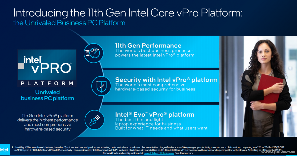 第11代博锐支持最新的Wi-Fi 6E (Gig+)技术,并提供了业界首个基于芯片的 AI 威胁检测解决方案,以帮助阻止勒索软件和加密挖掘攻击。与此同时,英特尔还带来了基于Evo认证的博锐平台,可以为时尚轻薄的笔记本电脑提供强大动力,使其具备出色的响应能力、基于雷电4的强大连接能力以及即时唤醒功能和真实应用场景下的长续航时间。