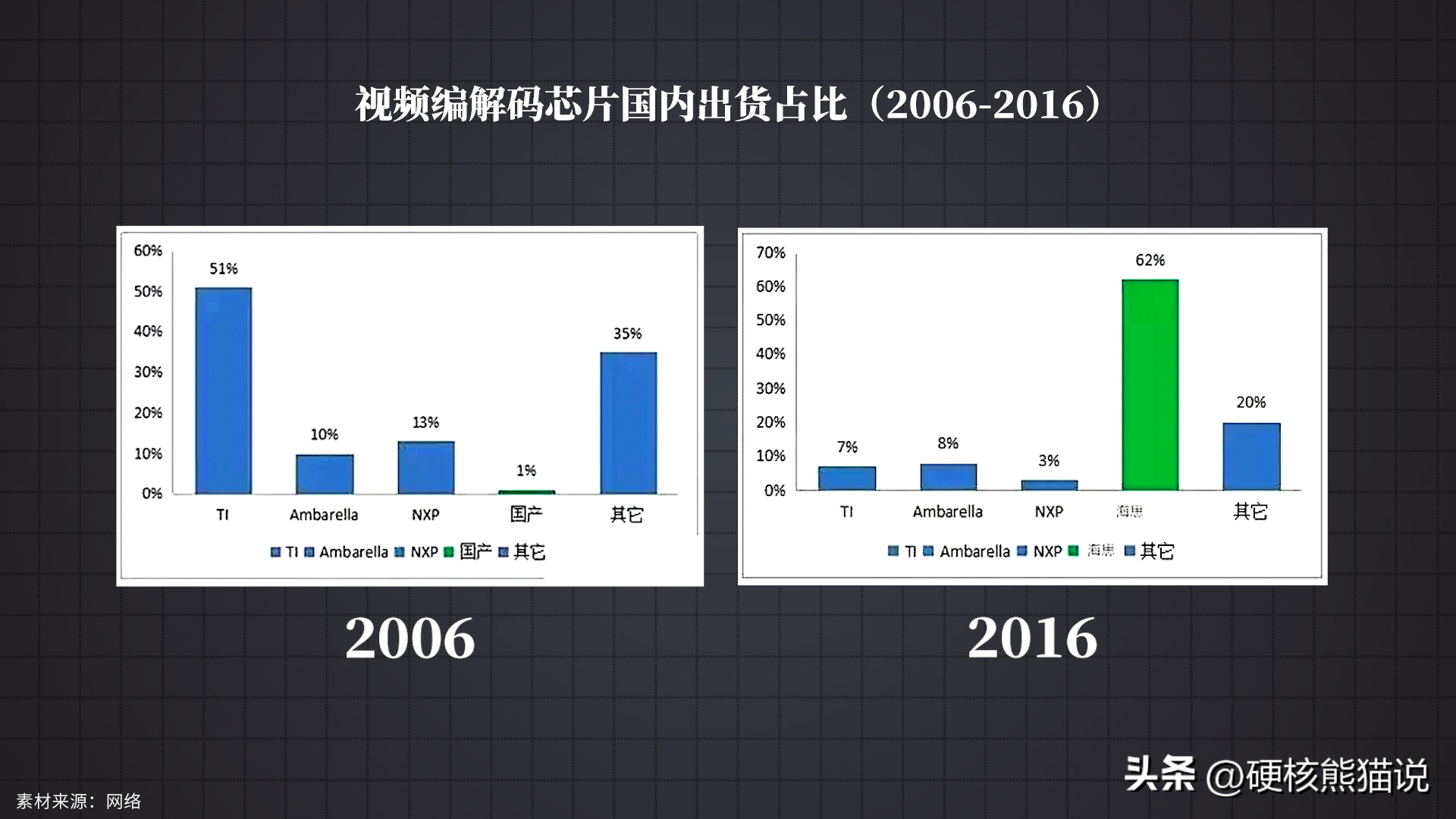 2016年之前,国际安防芯片是以德州仪器(Ti)、恩智浦半导体(NXP)、安霸等外企为主,而在2016年之后,海思也已经成为全球最大安防芯片企业,市场份额稳定在60%以上,妥妥的隐形霸主。相反的,那些傲慢的国际巨头,已经基本被摁在地上摩擦了。