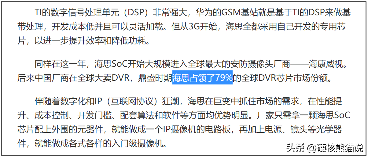 2007年,华为海思与如日中天的大华股份签订共同研发合同,2010年,海思安防芯片又征服了当时安防第一巨头的海康威视,此后海思越做越勇,很快就拿下国内外79%的DVR芯片市场份额。
