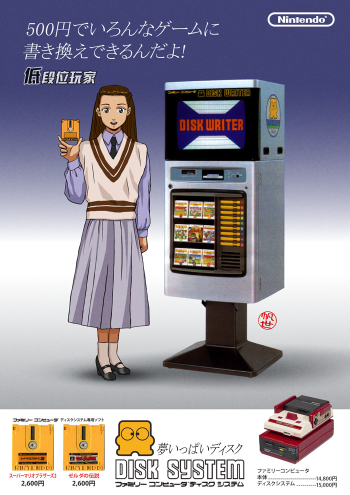 然而,ROM卡带的地位很快就受到了威胁,随着软盘成本的下降,储存容量更大且可以反复擦写的软盘马上就替代ROM卡带成为了电脑游戏介质的主流,任天堂乘着这股东风开发了FC磁碟机,它使用成本更低的“Quick disk”软盘作为载体,还提供了《塞尔达传说》《高尔夫》等任天堂王牌作品。任天堂在零售店设置了名为Disk Writer的游戏贩售机,玩家只需要花费500日元就可以擦掉旧游戏、写入新游戏,并且可以通过门店中的Disk Fax设备上传分数参与排名,堪称最早期的“电子游戏”和“奖杯系统”,然而老任靠FC磁碟机大赚一笔的如意算盘并没有打响,ROM卡带的容量马上发展到了原来的3倍以上并且还加入了存档电池技术,也就是从此之后,主机市场就没有软盘的位置了。