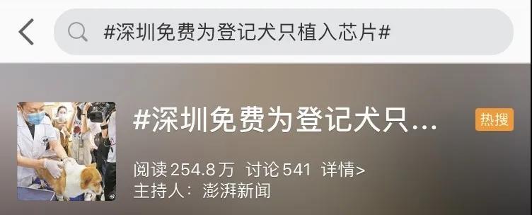 近日,一则#深圳免费为登记犬只植入芯片#的话题登上热搜。
