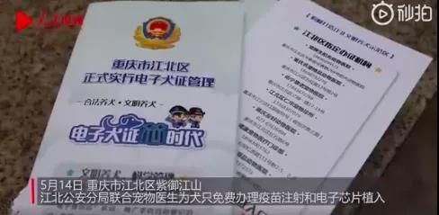 在今年5月14日,重庆市江北公安分局联合辖区内一家宠物医院的医生,为狗狗免费办理疫苗注射、电子芯片植入。据不完全统计,仅江北区一年发生的涉犬纠纷,就达200起以上。为此,江北区公安分局在全市首推电子芯片植入及电子犬证管理模式,用科技手段给狗狗装上电子身份证。自去年8月,重庆辖区推广以来,已经成功安装了五千余例。