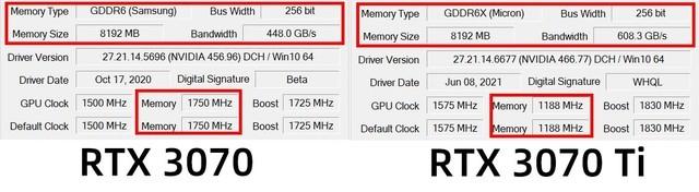 不过实际情况下,使用GDDR6显存的RTX 3070显存频率会更高,公版为1750MHz,所以最终显存带宽为448 GB/s。