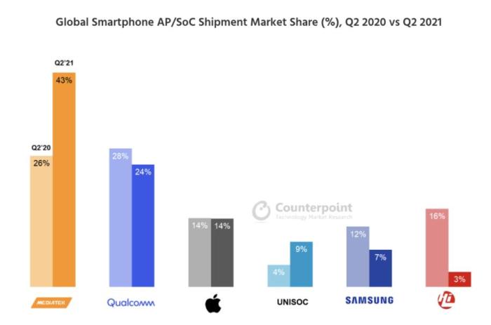 事实上,紫光展锐不仅在智能手机芯片上表现给力,今年在智能手机芯片上也一样给力,上半年增长122%,2021年2季度手机芯片市场份额为9%(去年同期为4%),排名全球第四,仅次于联发科、高通、苹果。