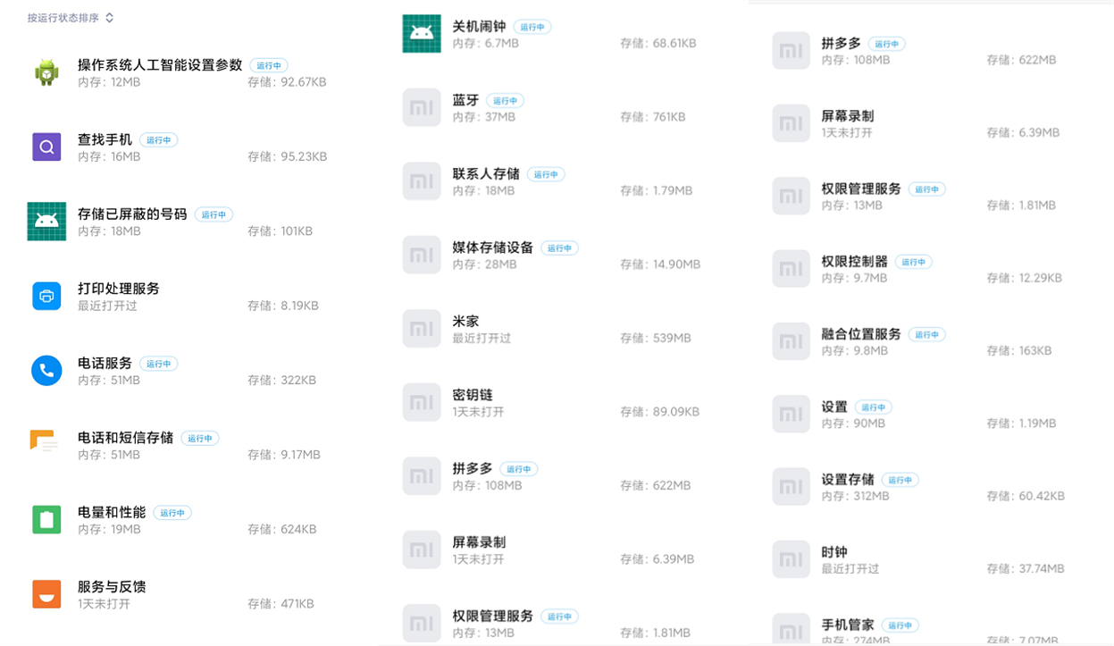 一些用安卓机的用户可能知道,就算手机后台没有运行任何的应用程序或是刚重启,运行内存也只会剩下一半左右(12G、16G同样如此)。这主要是因为安卓在开机后,为了保证系统稳定运行,会自启动一系列系统应用,当然也有一些是用户自己选择自启动的。从这张截图就能看出,在清理完后台后,仍有不下于15个系统应用在后台“悄悄运行”,而且大多数应用还是不能随便停用的,否则可能会导致系统崩溃。