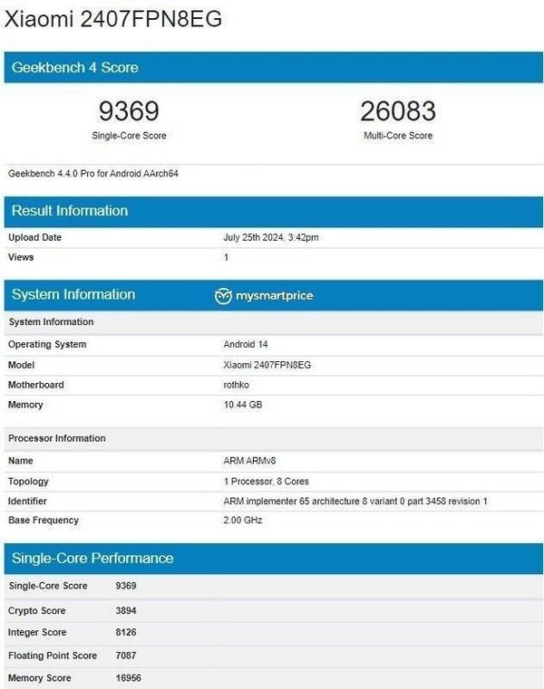 小米14T Pro在单核测试中得分为9369分,在多核测试中得分为26083分。这款手机采用的是“Rothko”主板,并搭载八核SoC,峰值频率为3.4GHz,配备Mali-G720-Immortalis MC12 GPU。