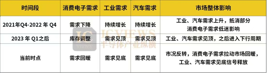 2022年Q4及2023年Q1,随着工业、汽车对模拟芯片需求的见顶,应用于这两大市场的电源管理芯片和信号链芯片的价格见顶并进入下行周期。而消费电子类模拟芯片已率先进入库存调整和消化阶段。