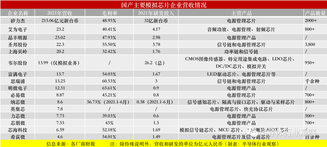 下图是国内主要的模拟芯片厂商2021年的营收、毛利率、主营产品种类和部分产品数量等信息。从这些数据中我们或许可以对国产模拟芯片的实力窥得一二。
