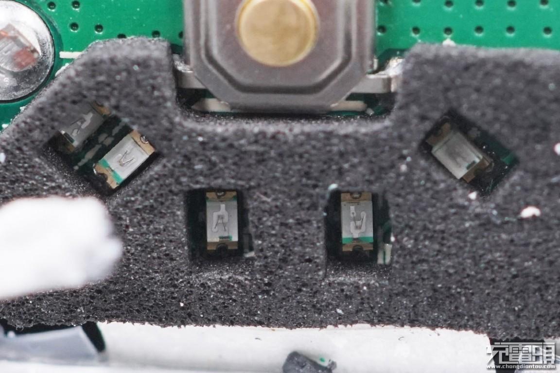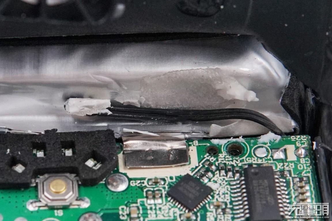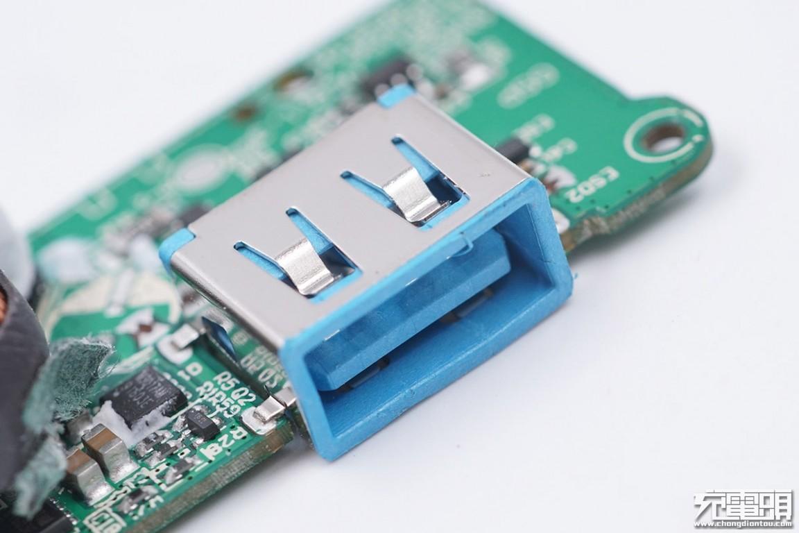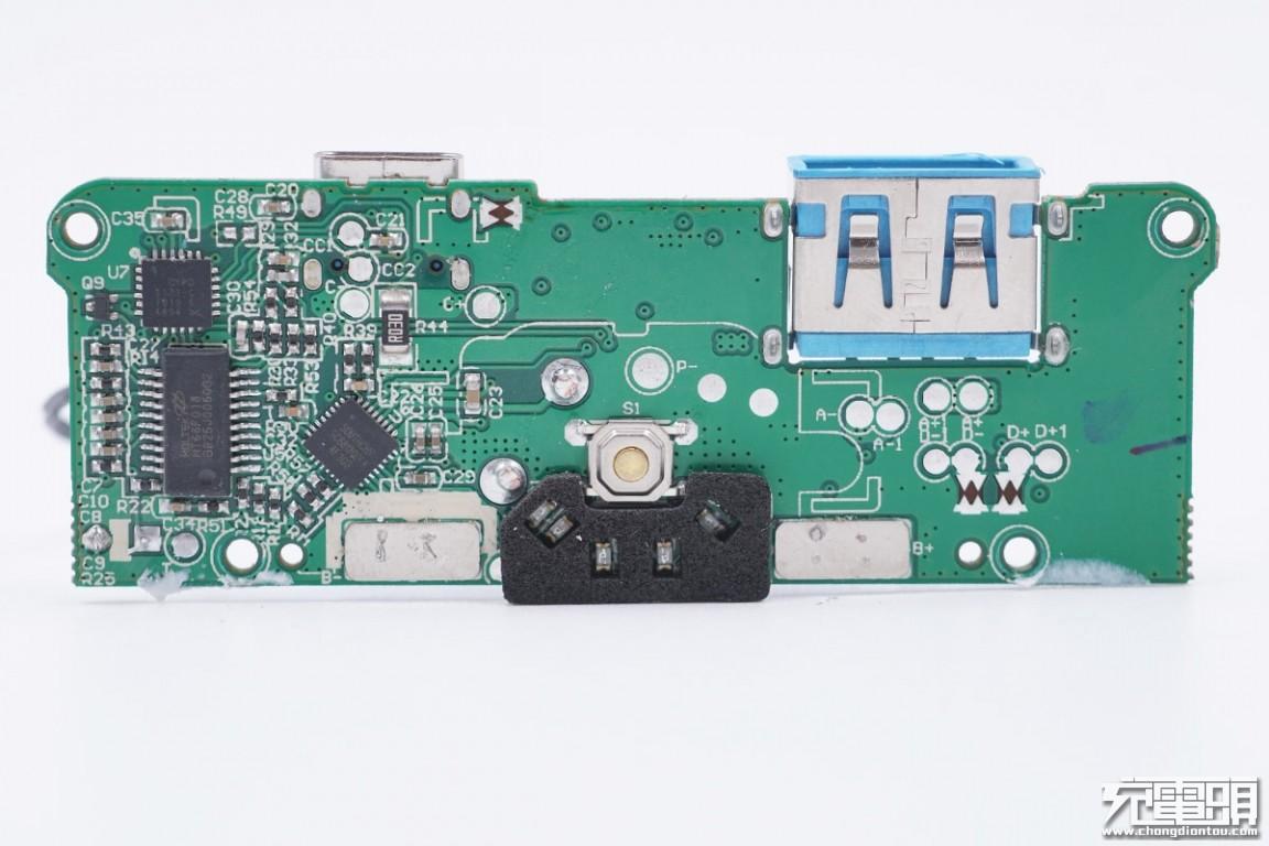 这款移动电源封装做得非常好,费了很大力气才拆开PCB板所在位置的外壳。PCB板通过黑色螺丝固定,USB-A接口为沉板过孔焊接,指示灯之间通过黑色泡棉隔开。
