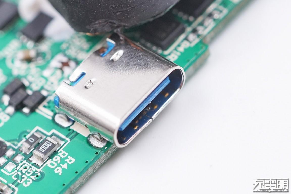 PCB板另一面元器件一览:USB-A接口、USB-C接口、磁环电感、两颗固态电容等。此外USB-A接口外壳上贴有防尘胶带。