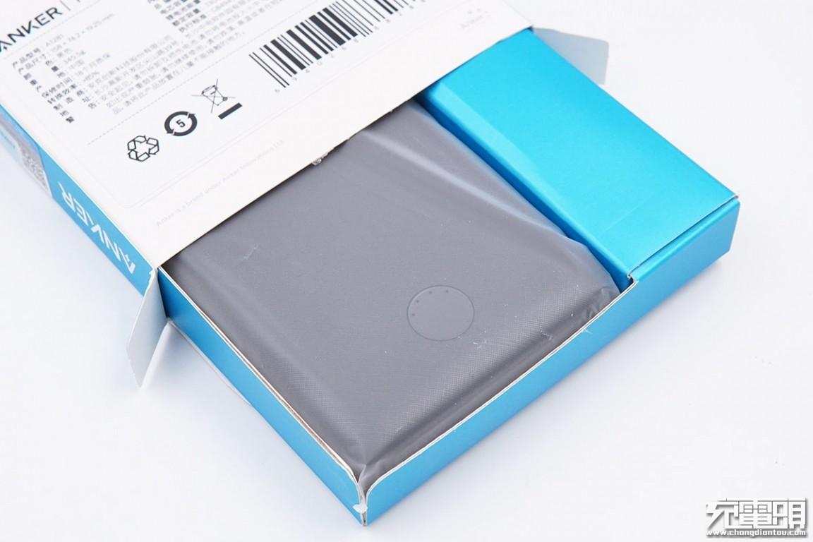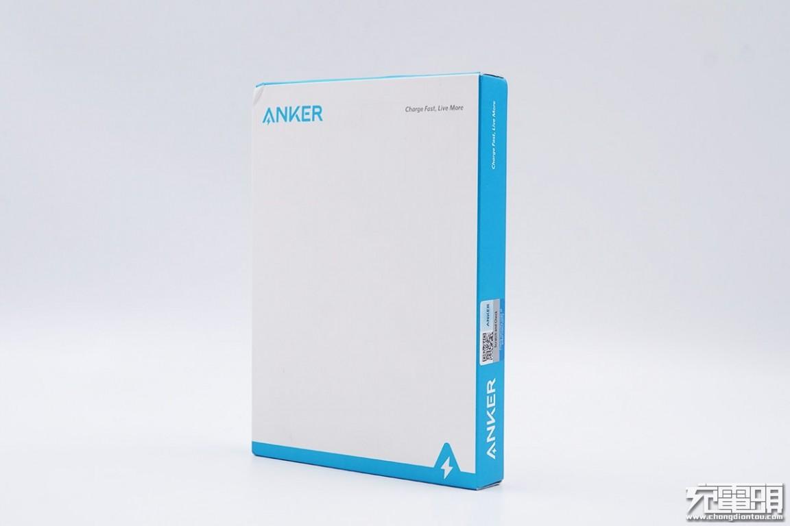 移动电源外包装盒,正面白色侧面蓝色,左上角是“ANKER”品牌字样。