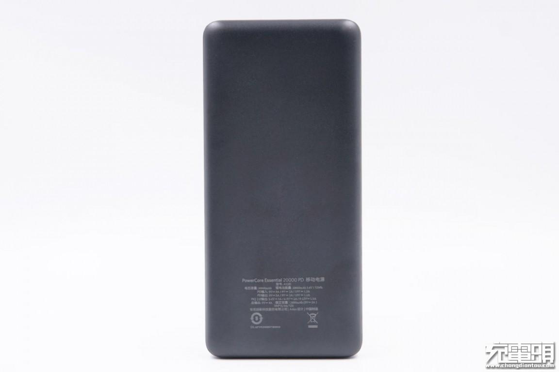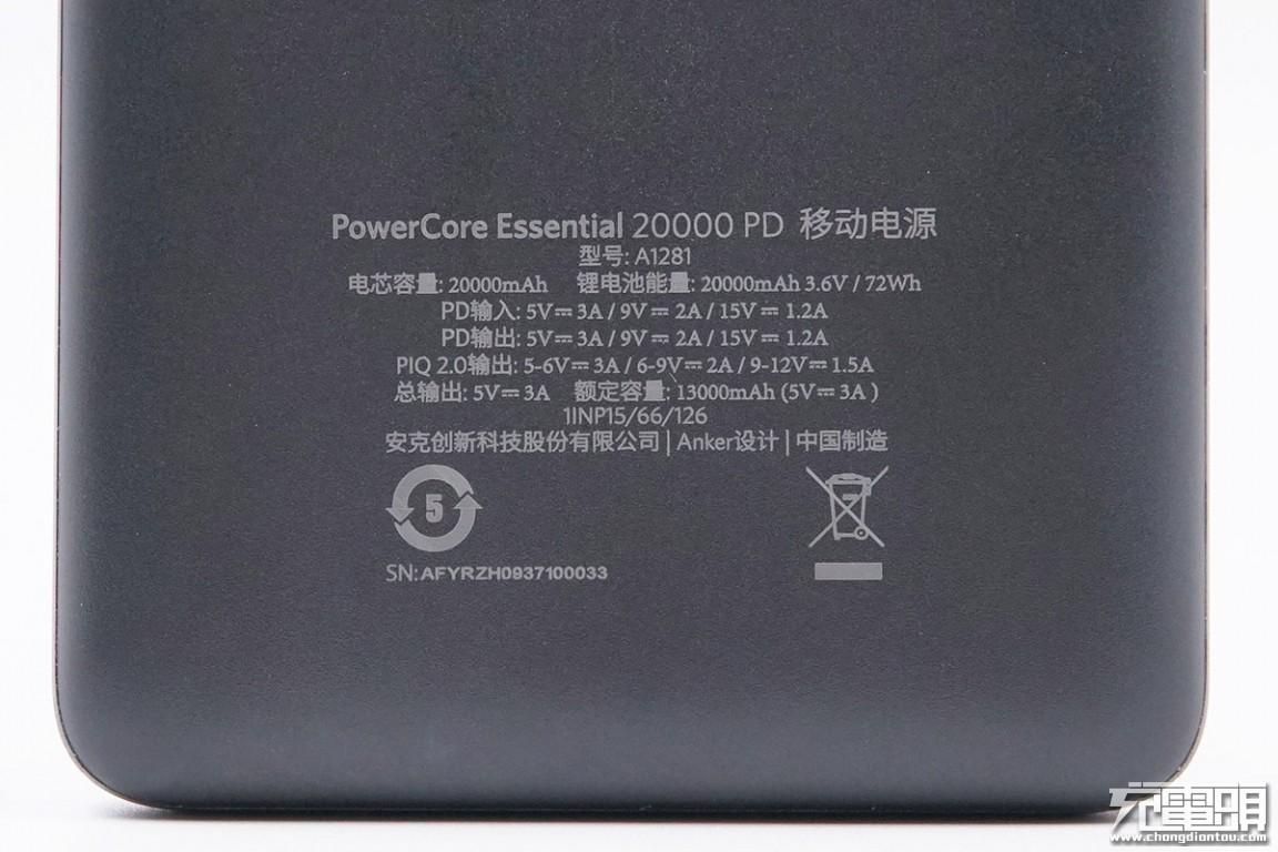 产品名称:PowerCore Essential 20000 PD 移动电源型号:A1281电芯容量:20000mAh 锂电池能量:20000mAh 3.6V/72WhPD输入:5V/3A、9V/2A、15V/1.2APD输出:5V/3A、9V/2A、15V/1.2APIQ 2.0输出:5-6V/3A、6-9V/2A、9-12V/1.5A总输出:5V/3A额定容量:13000mAh(5V/3A)SN:AFYRZH0937100033安克创新科技股份有限公司制造