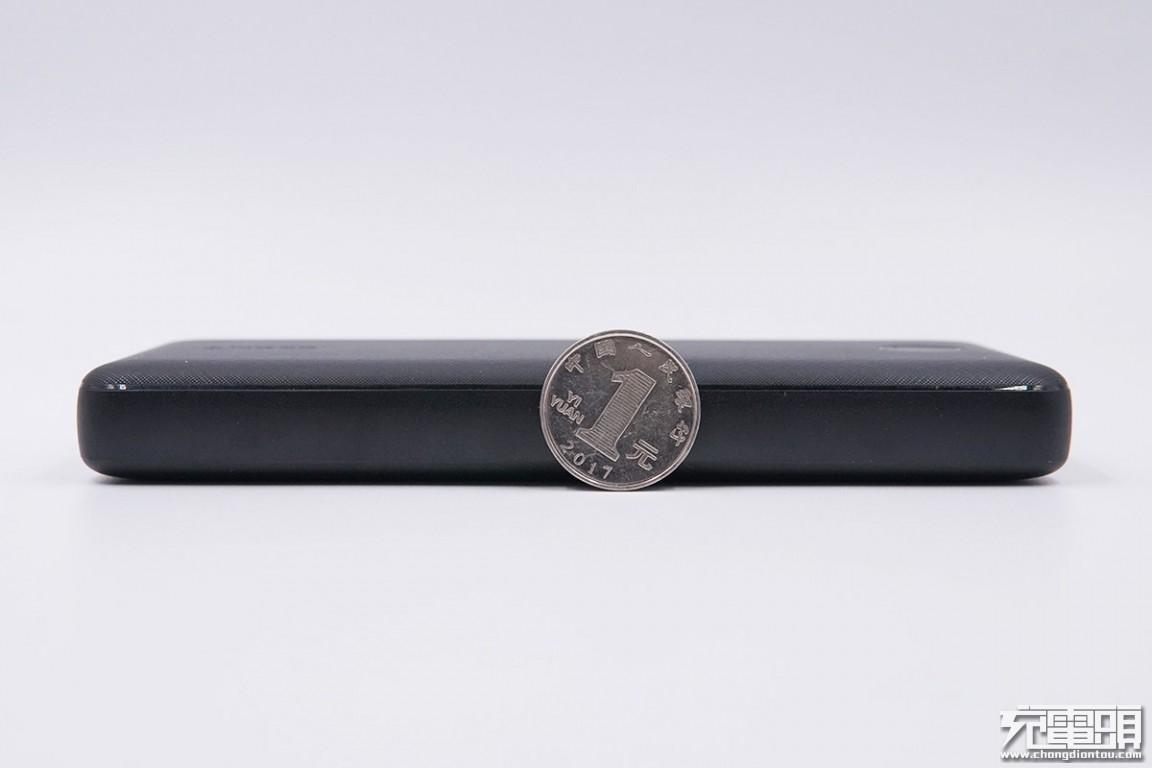 充电宝采用PC阻燃材质黑色外壳,表面做了晒纹处理,边缘及四角为弧面过渡不硌手,一端是品牌logo另一端是电源开关键。