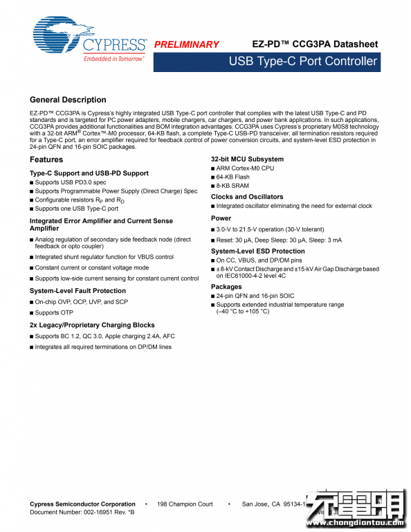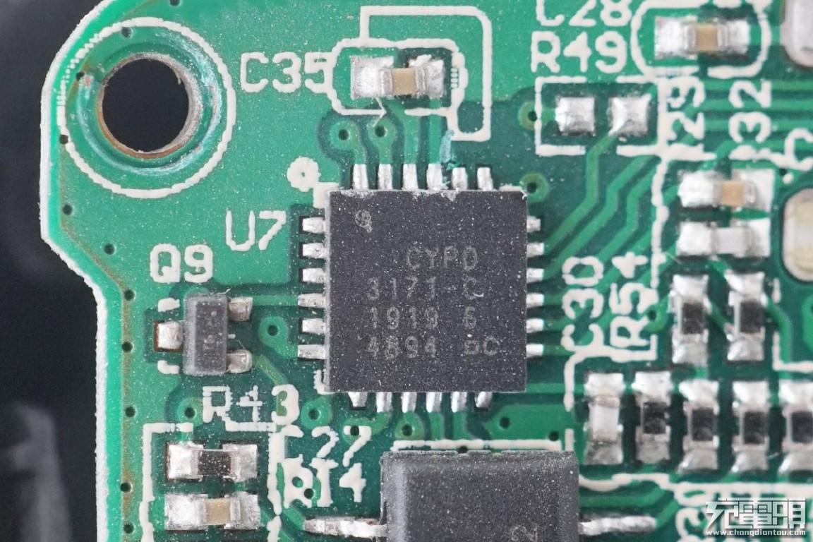 USB PD快充协议芯片,赛普拉斯CYPD3171。CYPD3171为赛普拉斯第三代产品CCG3PA,其内建ARM Cortex-M0处理器,64KB Flash 8KB SRAM,支持QC4.0、APPLE 2.4A,AFC、BC1.2等充电协议。