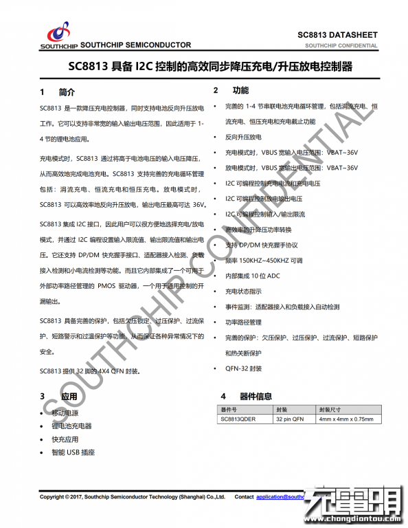 南芯SC8813详细规格资料。充电头网了解到,南芯SC8813在小米移动电源3 USB-C双向快充版、紫米20000mAh移动电源QB822、紫米10000mAh USB PD快充移动电源QB910均有用到。