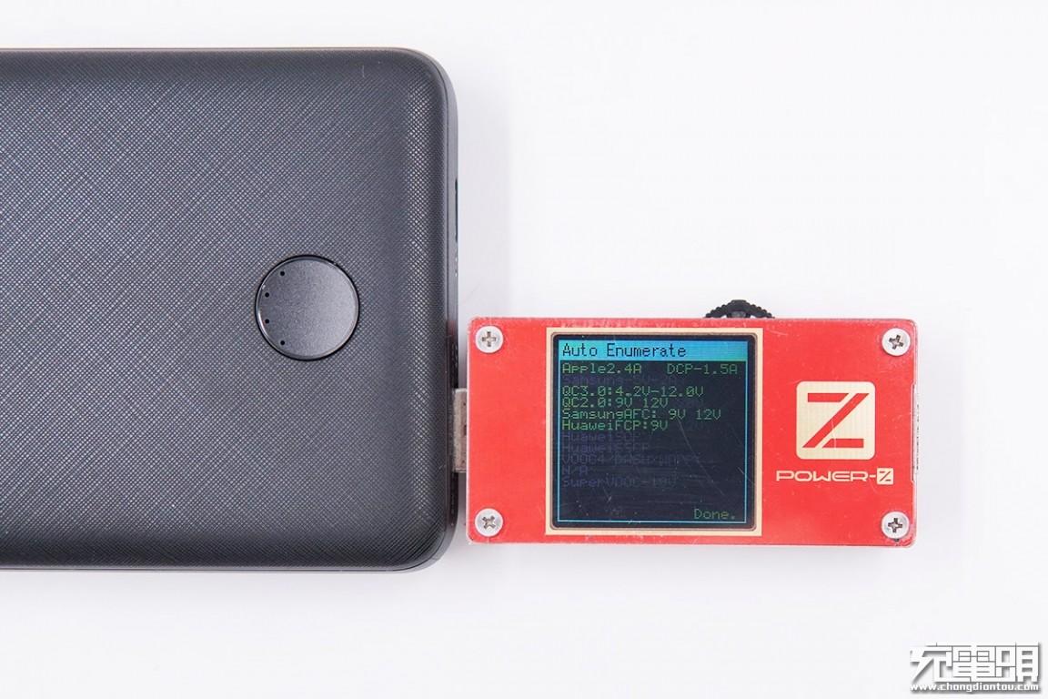 使用ChargerLAB POWER-Z KT001检测USB-A口的输出协议,显示支持Apple 2.4A、USB-DCP协议,以及QC2.0、QC3.0、Samsung-AFC、Huawei-FCP快充协议。