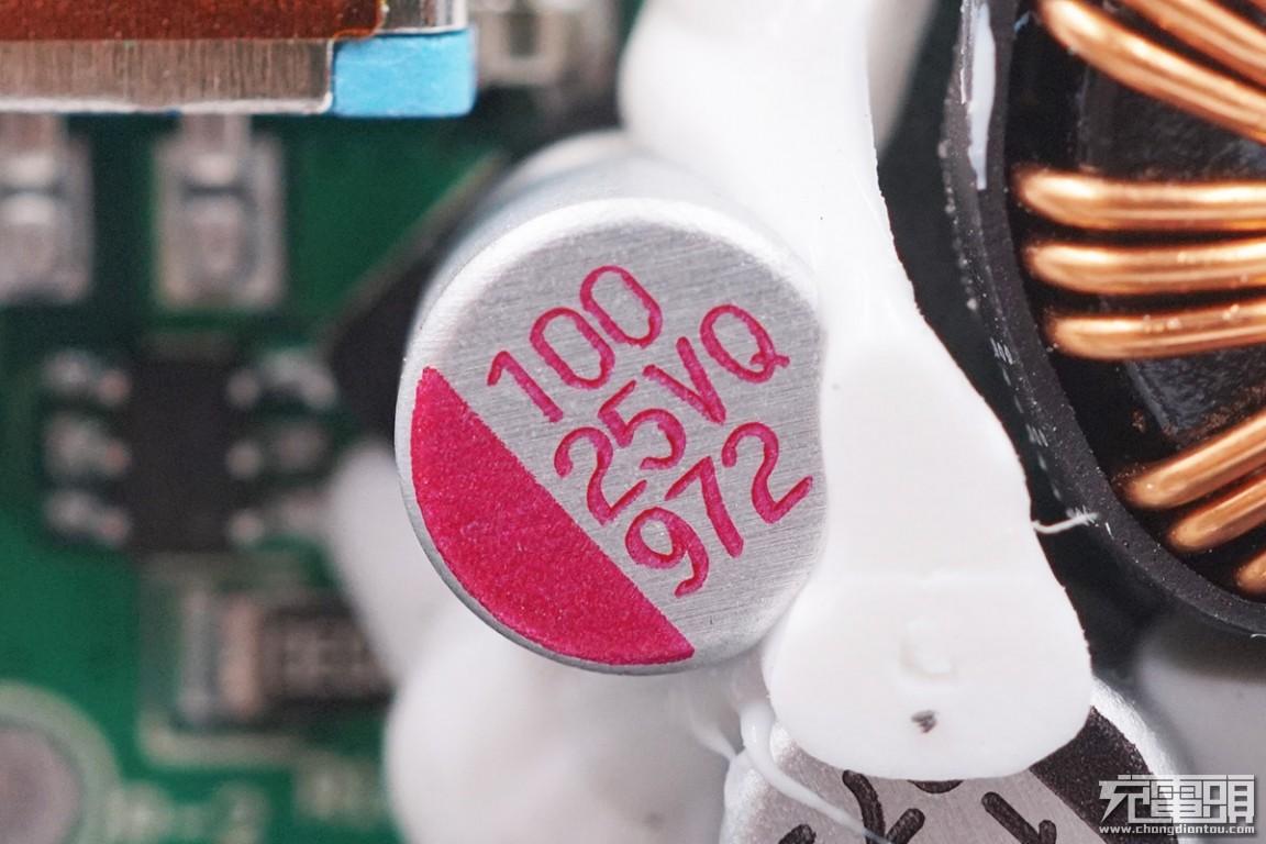 另一颗输出滤波固态电容,规格为100μF 25V,作为USB-C接口的滤波输出。两颗固态电容打胶固定。