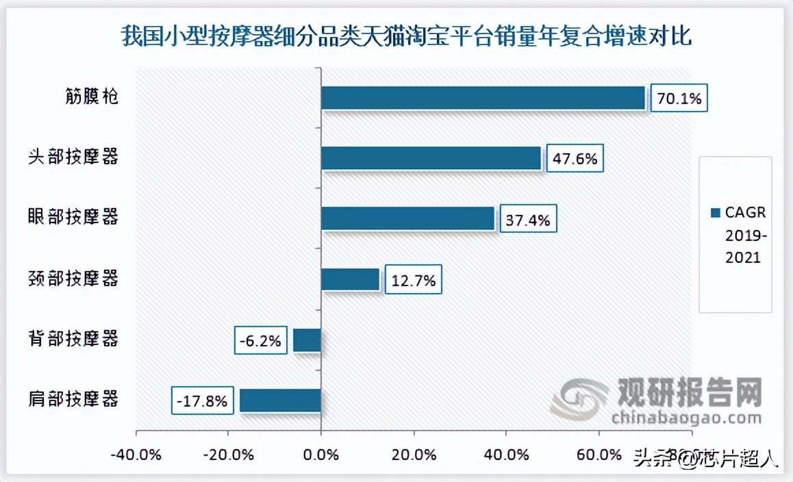 这两年的健身浪潮声势浩大,运动结束后的拉伸放松也怠慢不得,因此筋膜枪的市场也稳步增长中。根据数据,2021年筋膜枪在小型按摩器增长速度中拔得头筹。