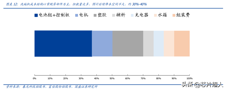 除主控板和电池组以外还包括:滚刷、水箱、污水箱、电机、万向轮、链接线、输水管、遥控柄、挡板、外壳,共约占洗地机成本的60%,目前洗地机单台成本约1000元/台 。